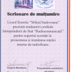 Scrisoare de mulțumire pentru suportul acordat la proiectarea și instalarea rețelei interne de radioficare la Liceul Teoretic "Mihail Sadoveanu"